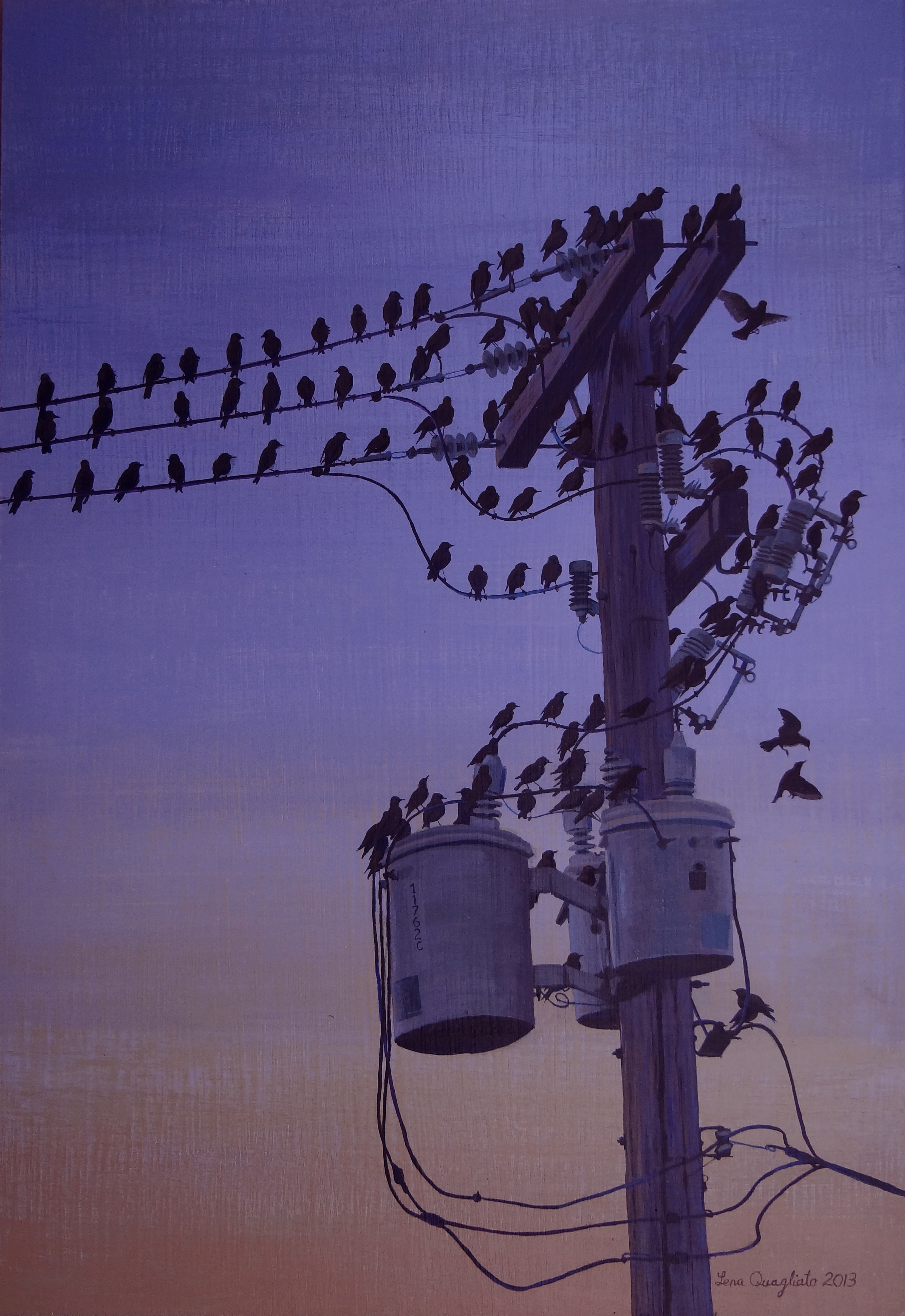 This is my latest painting, finished 11/19/13 I loved the composition that the telephone wires created. I also was fascinated with the numerous birds that were perched on every surface. The original is 11×16, making each bird aprox 1/2″ but I attempted to make each one individual and pack on as much detail as I could.